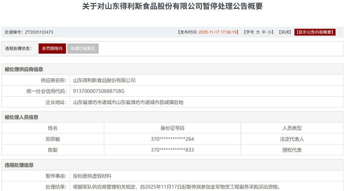 公告显示,在项目编号:2024-VQ01-W1059的采购活动中,得利斯存在违规失信行为。依据军队供应商管理相关规定,该公司自2025年11月17日起被暂停参加全军物资工程服务采购活动资格,处罚目前处于执行期。