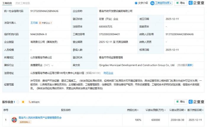 企查查信息显示,近日,青岛市政开发建设集团有限公司成立,法定代表人为王元斌,注册资本60亿元。